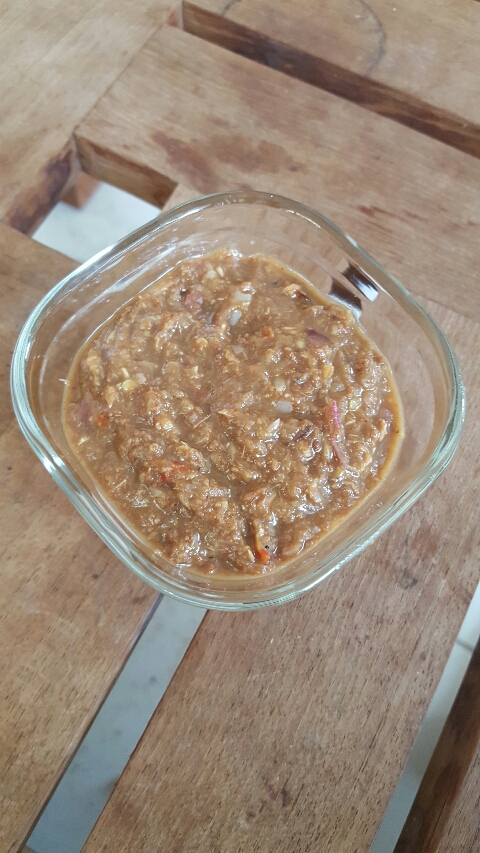ใช้หอมแดง กระเทียม ข่า และพริก เอาไปย่างจนหอม และเอาถั่วเน่าแผ่นมาย่างให้หอมเหมือนกัน เอาทุกอย่างลงครก ตำให้แหลก เราปรุสรสเปรี้ยวด้วยมะนาว เค็มด้วยเกลือกับซีอิ๊วขาว เติมน้ำต้มสุกลงนิดหน่อย
