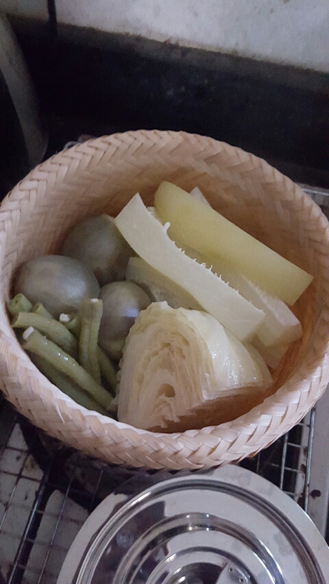 ส่วนผักนึ่งใช้มะละกอดิบ ถั่วผักยาว ทะเขือและกะหล่ำปลี