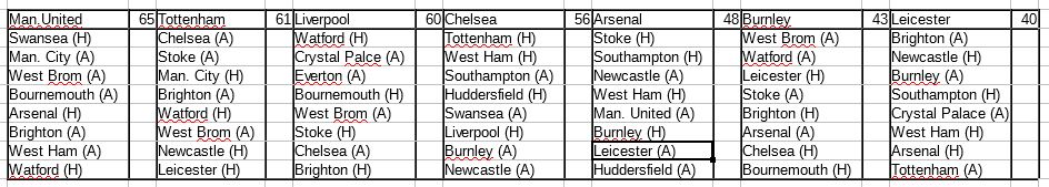 โปรแกรมโดยเฉลี่ยพอๆ กัน ส่วนใหญ่ถ้าไม่เจอทีมในกลุ่ม 8 ทีมนำ (เจอประมาณ 2-3 เกมใน 8 เกมที่เหลือ) ก็ไปเจอทีมหนีตกชั้นไปเลย มีทีมที่เจอเกือบยกแผงก็จะมีไบรท์ตัน (เจอ 5 ใน 7) เวสต์บรอม (เจอ 4 ใน 7) ลุ้นกันได้เลยครับว่าใครจะอยู่ใครจะไป