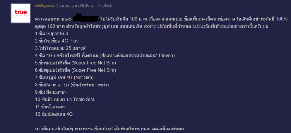 แจ้งเตือนรายการส่งเสริมการขาย “เปิดซิมใหม่ ซื้อแพ็คเสริม รับเงินคืน 100%” ของทรูมูฟเอช