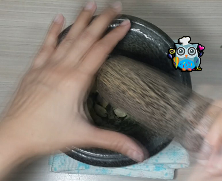 1.นำรากผักชี กระเทียม พริกไทยโขลกพอแหลกเป็นสามเกลอ พักเตรียมไว้