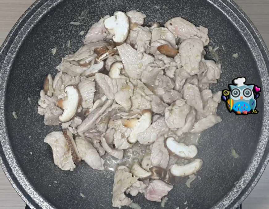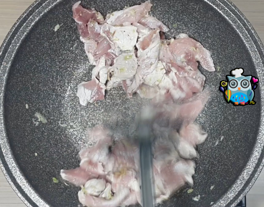 ใส่เนื้อหมูลงไป พอเนื้อหมูเปลี่ยนสีขาว