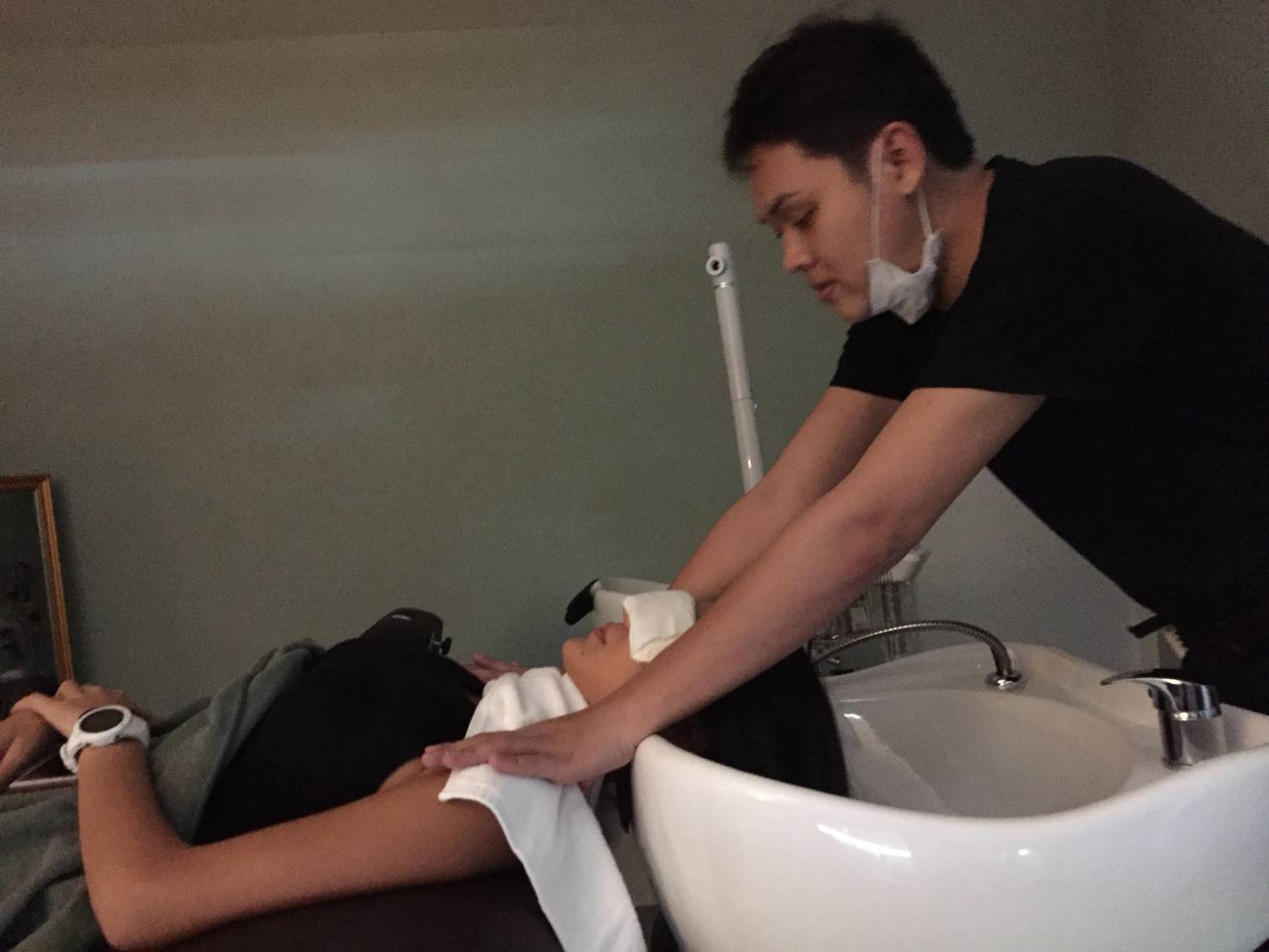 รู้ตัวอีกทีตอนพนักงานบอกว่าจะสระผมด้วยน้ำเย็นแล้วนะครับ เวลาสระผมเราเค้าก็นวดๆ จากหน้าผากวนไปที่คอ วนไปวนมา พร้อมกับเกา เบาๆ สบายมากเลยค่ะ ลองแล้วจะชอบ ที่ร้านจะสระทั้งหมด 2 รอบ นวดหัวให้ทั้ง 2 รอบ ชอบมากค่ะ