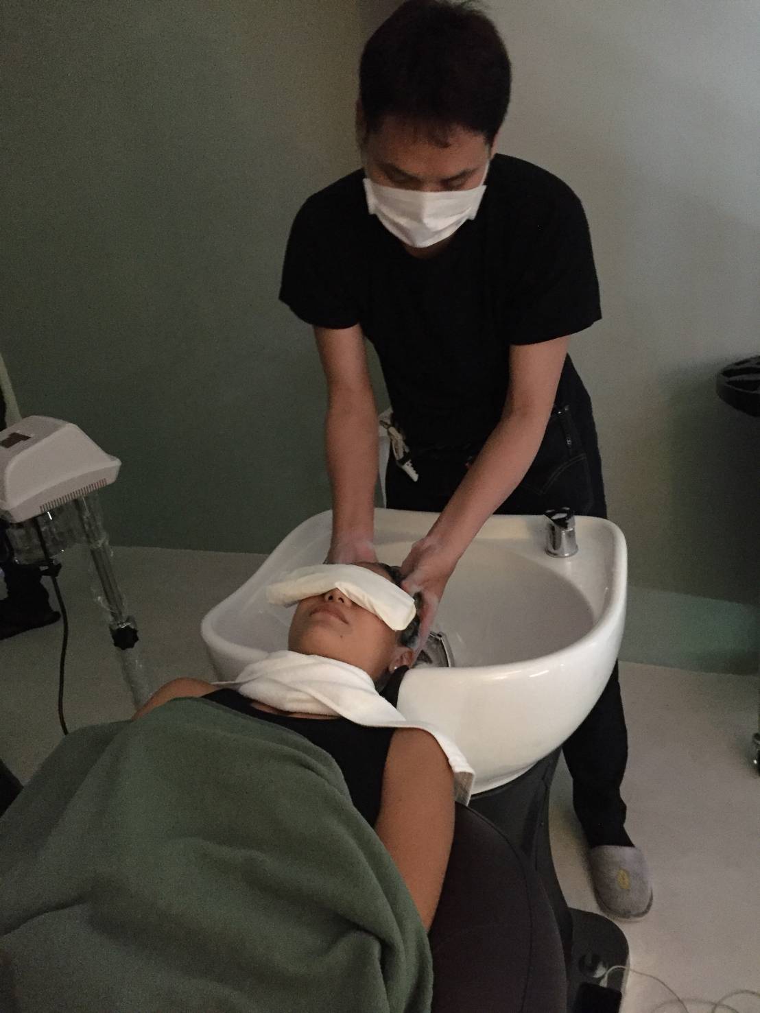หลังจากสระเสร็จก็เริ่มทำ treatment บำรุงหนังศรีษะและเส้นผม ทำไปพร้อมๆกับการอบโอโซนเพื่อผลักวิตามินให้เข้าสู่เส้นผม ทำทีละช่อละช่อ งานละเอียดก็มาค่ะ