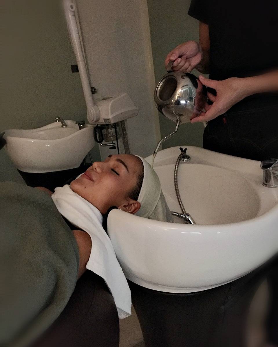 ขั้นตอนการเทน้ำร้อนเพื่อชะล้างไขมันอุดตันและสิ่งสกปรกบนหนังศรีษะ แต่ไม่ได้ร้อนมากนะคะ