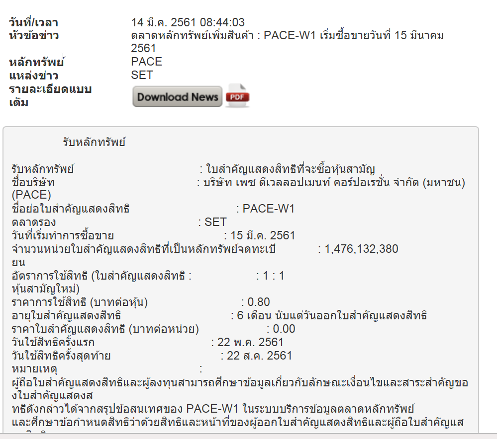 PACE-W1 & PACE-W2 : เริ่มซื้อขายพรุ่งนี้ 15/3/2561