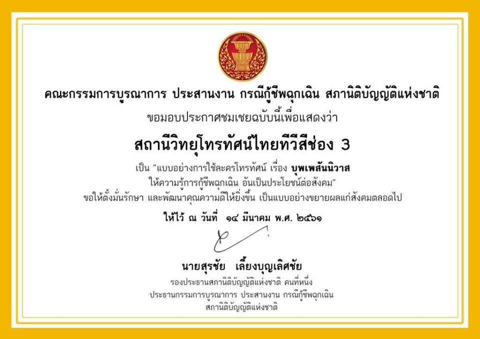 สภานิติบัญญัติแห่งชาติ ประกาศชมเชย ละคร”บุพเพสันนิวาส”ช่อง3 เป็นแบบอย่างละครโทรทัศน์ ให้ความรู้สังคม รองประธาน สนช. ชื่นชม ฉาก นางเอกปฐมพยาบาลพระเอกจมน้ำถูกวิธี