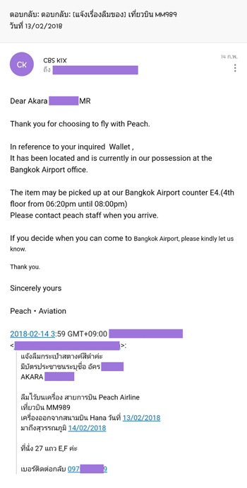 ยังไงก้ขอบคุณสายการบิน Peach Airline มากที่ช่วยเหลือ ตามหากระเป๋าตังให้