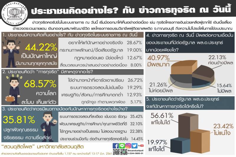 เมื่อวันที่ 18 มี.ค. “สวนดุสิตโพล” มหาวิทยาลัยสวนดุสิต ได้เปิดเผยผลสำรวจความคิดเห็นของประชาชนทั่วประเทศ จำนวน 1,157 คน ในหัวข้อ “ประชาชนคิดอย่างไรกับข่าวทุจริต ณ วันนี้” หลังจากที่มีข่าวออกมาให้เห็นอย่างต่อเนื่อง เช่น ทุจริตโครงการเงินช่วยเหลือผู้ยากไร้ เงินเบี้ยเลี้ยงตำรวจตระเวนชายแดน เป็นต้น โดยทำการสำรวจระหว่างวันที่ 13-17 มี.ค. 61ทั้งนี้เมื่อถามว่าประชาชนมีความคิดเห็นอย่างไรกับข่าวทุจริตในระบบราชการวันนี้ พบว่า