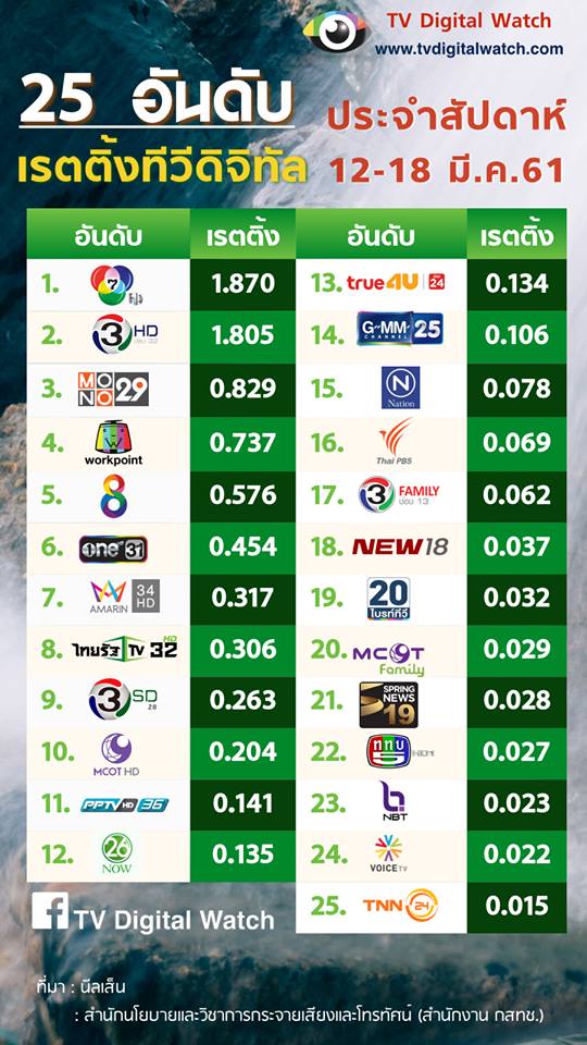 25อันดับเรตติ้งทีวีดิจิตัล 12-18 มี.ค 61 ใกล้เข้ามาอีกนิด ช่อง 3 ชิดๆ ช่อง 7 อีกหน่อย