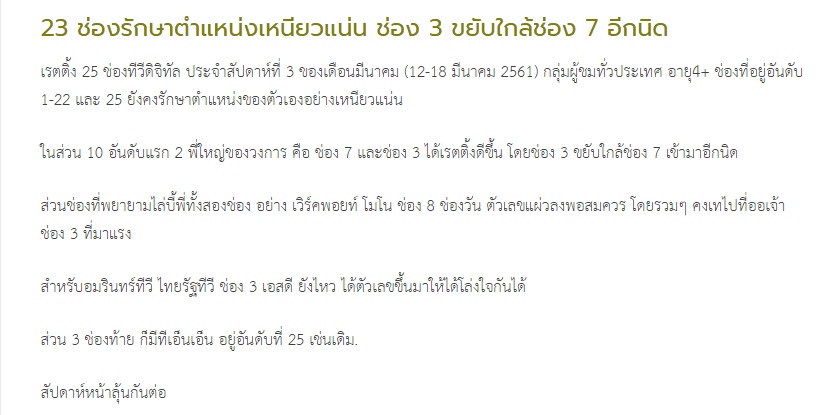 25 อันดับเรตติ้งทีวีดิจิตัล 12-18 มี.ค 61 เรตติ้งช่อง3 มาแรงแบบ ก้าวกระโดด มาก หูยยยยยยยยยยยยยยย