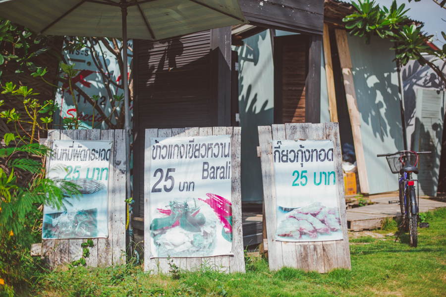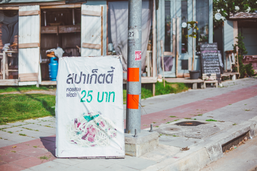 มีป้ายเรียงราย เป็นรูปอาหาร และชื่อเมนู พร้อมราคา 25 บาท