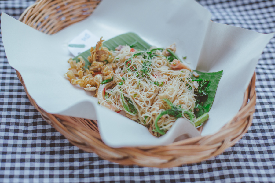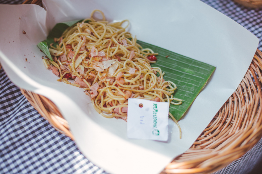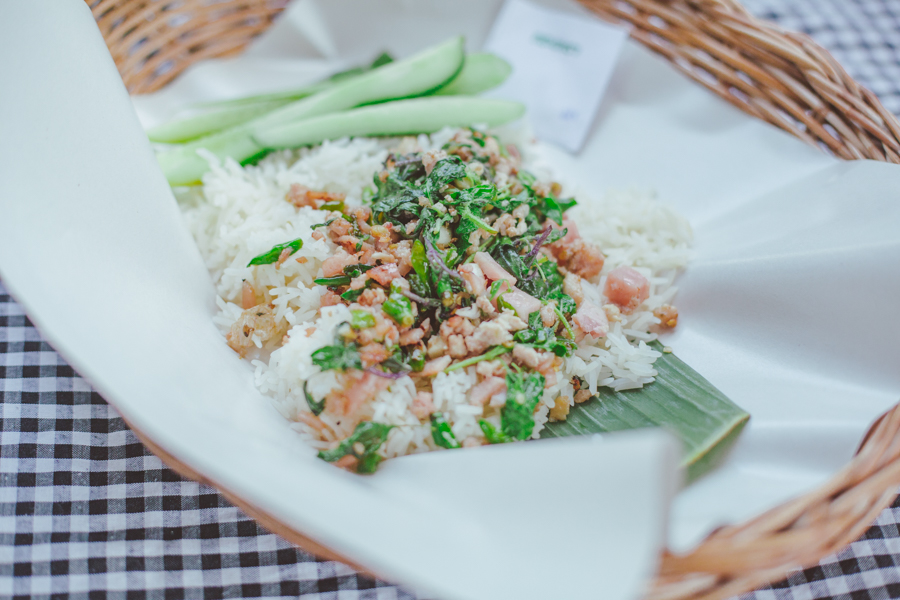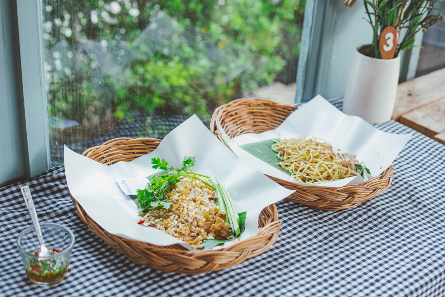 หน้าตาอาหาร ก็จะประมาณนี้ค่ะ ใส่ตะกร้าไม้เล็ก ๆ มีกระดาษและใบตองรอง