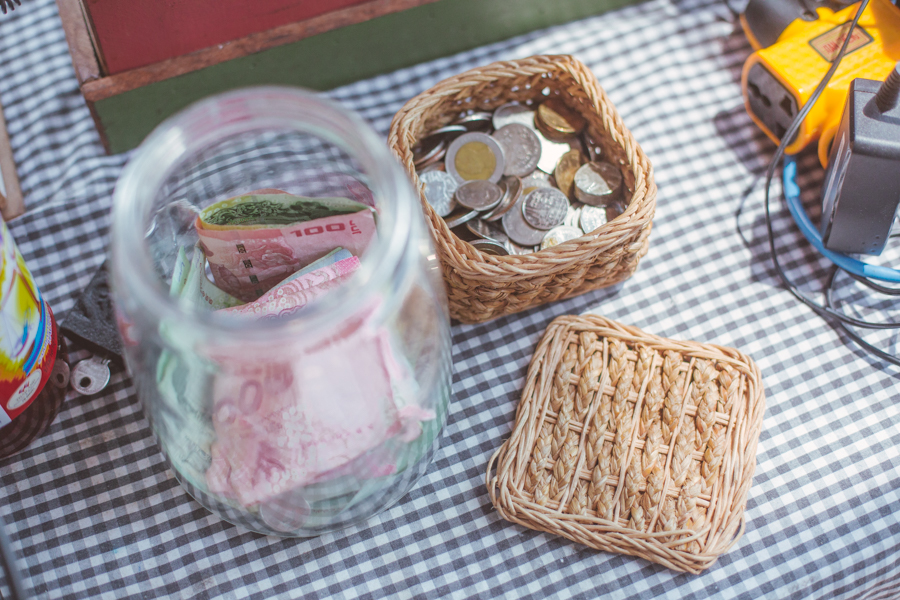 คิดเงินตามที่เรากิน ไปจ่ายเงินในกระปุก และหยิบเงินทอนจากในตะกร้า