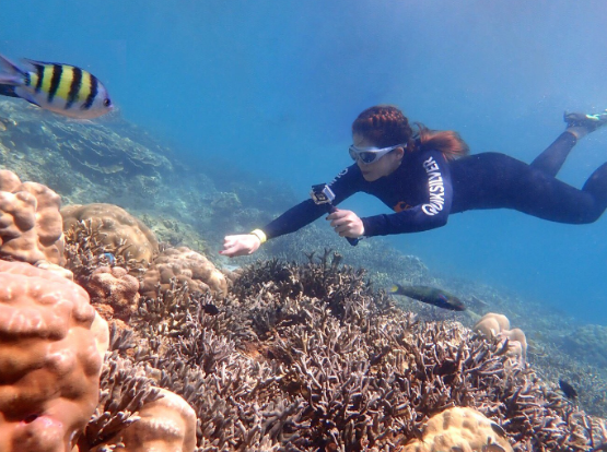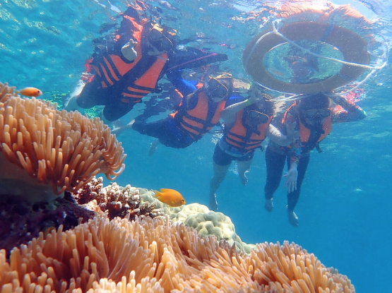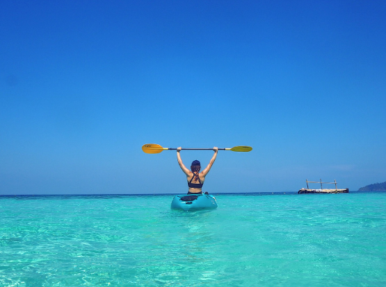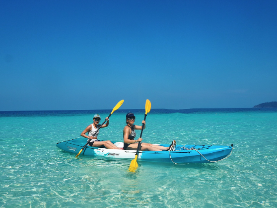 กิจกรรมวันนี้ก็จะมีดำน้ำ พักกินอาหารเที่ยง พายเรือ ถ่ายรูปเล่นชายหาด แล้วปีนเขาเพื่อดูจุดชมวิวเขาช้างเผือกค่ะ