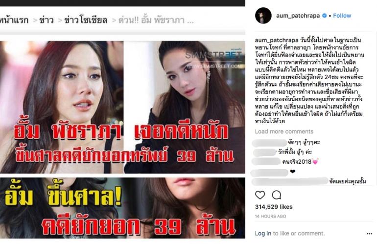 ทำเอาซุป'ตาร์ตัวแม่ อั้ม พัชราภา ไชยเชื้อ เดือดสุดๆ หลังจากที่เจ้าตัวเดินทางไปขึ้นศาลอาญาเพื่อเป็นพยานฝ่ายโจทก์ในคดีคดีหนึ่ง แต่กลับมีเว็บไซต์บางแห่งพาดหัวข่าวทำนองว่าอั้มเจอคดีหนัก ขึ้นศาลคดียักยอกทรัพย์ 39 ล้าน ทำให้เจ้าตัวได้รับความเสียหาย กระทบต่อชื่อเสียง จนทำให้เจ้าตัวต้องโพสต์เตือนผ่านไอจีว่าให้ลบข่าวออก ไม่อย่างนั้นจะฟ้องเรียกค่าเสียหาย