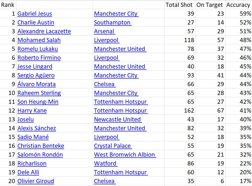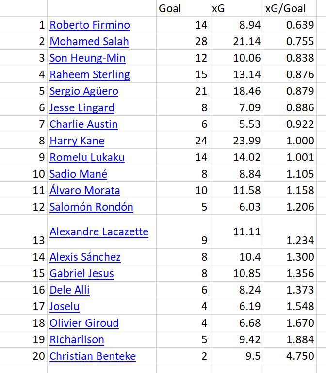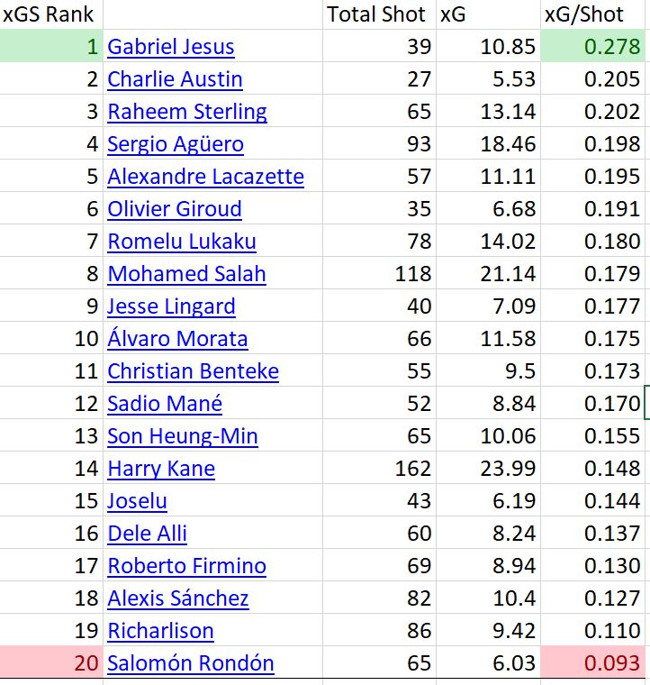 ผลที่ได้ ก็ตามในตาราง ซิตี้ส่งกองหน้าเข้ามาถึงสามคนในสี่อันดับแรก ตามด้วยสองดาวยิงจากอาเซนอล ลูกากูกับซาล่านั้นได้โอกาสที่มีคุณภาพพอๆกัน ซึ่งแย่กว่าโอกาสที่ซิตี้สร้างได้ถึงเกือบๆ 10% ต่อครั้งเลยทีเดียว