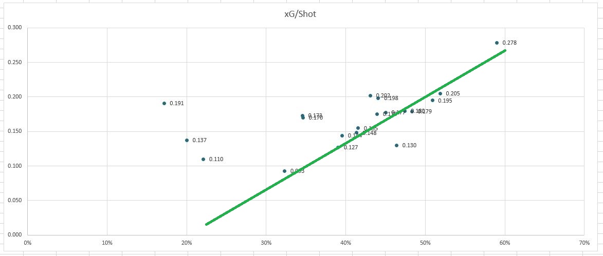 ผมคิดว่าเวลาเทียบประสิทธิภาพศูนย์หน้า นอกจากคำถามว่ายิงเท่าไหร่แล้ว สิ่งที่ตามมาคือ "คมแค่ไหน" ทีนี้ไอ้คมแค่ไหนมันตอบยากครับ EPL ให้ตัวเลข "หมูหก" มาแต่ดันไม่ให้ว่าตกลงโอกาสเหน่งๆ ที่แต่ละคนได้น่ะ มันเท่าไหร่ นึกไปนึกมา ก็นึกได้ว่า Big Chance(BC) นี่ในทางสถิติก็คือโอกาสที่ในทางสถิติแล้วจะมีความน่าจะเป็นที่ได้ประตู 30% ขึ้นไป (xG > 30) เราหาจำนวน BC ไม่ได้ก็จริง แต่มีเว็ปที่ให้ xG รวม ดังนั้นเราสามารถประเมินคุณภาพการยิงเฉลี่ย ได้โดยใช้ xG/Shot ถ้าค่านี้สูง เราก็บอกได้ว่า นักเตะนั้นได้โอกาสจ่อๆมาก ไม่ว่าจะเพราะทีมปั้น หรือ เก่งเองก็ตาม