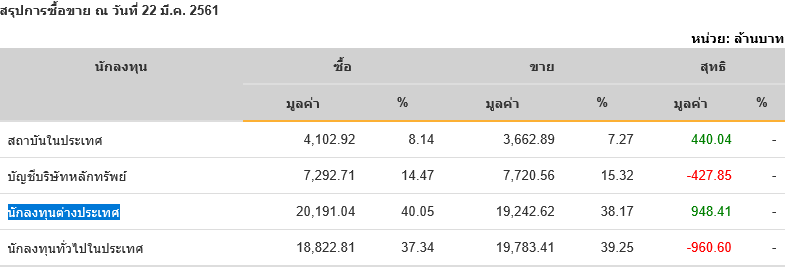 Sinthorn Summary 22/3/2561 : ต่างชาติซื้อสุทธิ 948.41 ลบ.