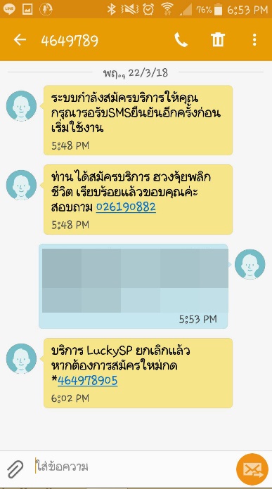 และต่อด้วย sms ที่สอง เวลาเดียวกัน ว่า "ท่านได้สมัครบริการ ฮวงจุ้ยพลิกชีวิต เรียบร้อยแล้วขอบคุณค่ะ สอบถาม 026190882"