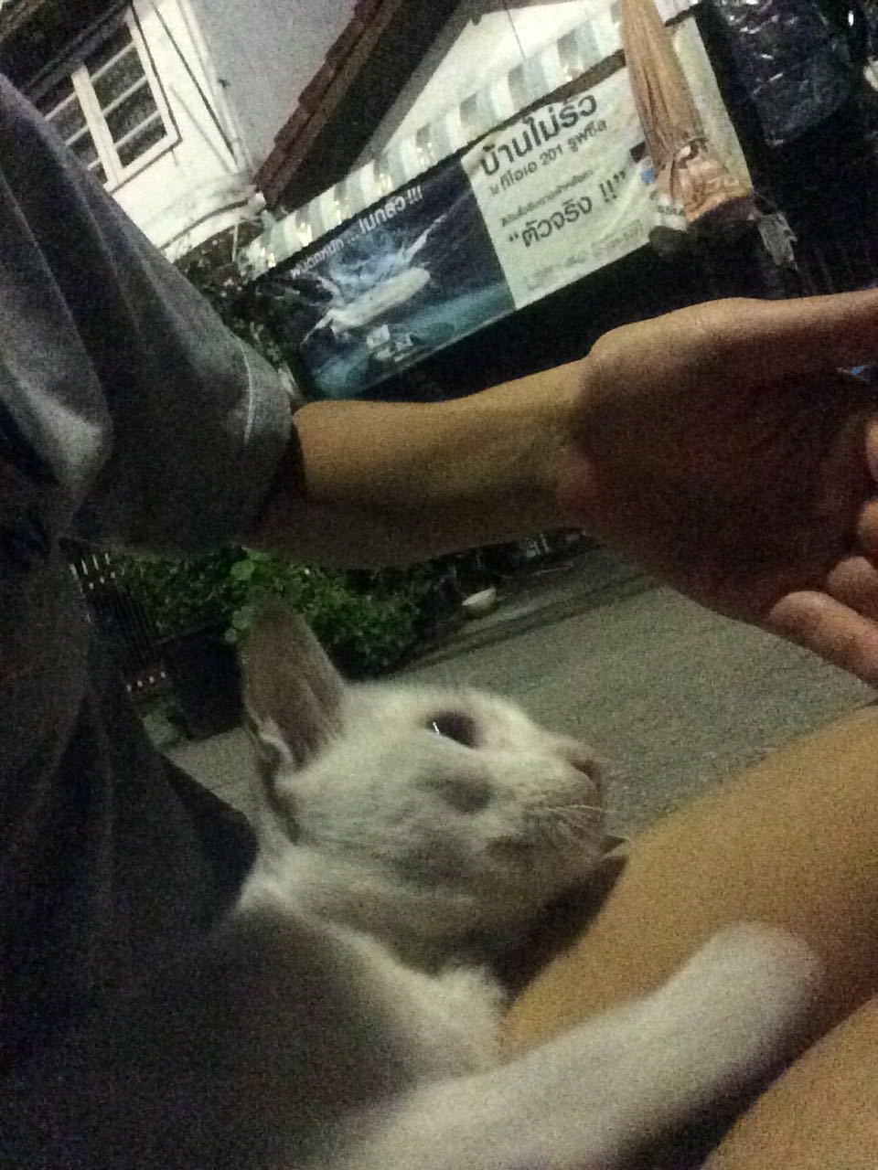 มีแมวสีขาวหน้าตามอมแมมวิ่งตาม พอเราหยุด คุณเธอ(มั้ง) ก็ล้มตัวลมนอนทับขาคลอเคลียไปมาสะงั้น พอเรานั่ง คุณเธอก็กระโดดขึ้นมานอนตักเราทันที
