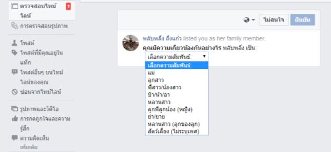 facebook บอกให้ตรวจสอบ ดังรูป ชื่อที่ปรากฎเป็นภรรยาผม แล้วถามว่ามีความสัมพันธ์อย่างไรกับผม ไม่มีช่องให้เลือกภรรยาน่ะคับ