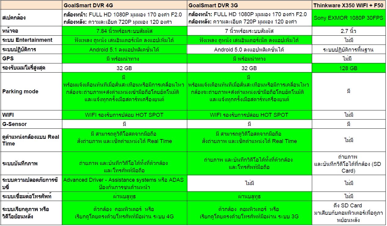สำหรับการเปรียบเทียบผมจะทำตารางเพื่อให้เข้าใจง่ายครับ และจะนำรุ่น Thinkware X350 ซึ่งมีราคาใกล้เคียงกับรุ่น GoalSmart DVR มาเปรียบเทียบครับ