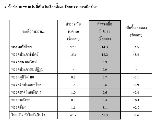 4.“หากวันนี้เป็นวันเลือกตั้งจะเลือกพรรคการเมืองใด” ผลปรากฏว่าคะแนนนิยมต่อพรรคการเมืองพบว่า พรรคเพื่อไทย อยู่ที่ร้อยละ 14.3(ลดลงจากผลสำรวจเมื่อเดือนพฤษภาคม 2560 ร้อยละ 3.5) รองลงมาคือพรรคประชาธิปัตย์ ที่มีคะแนนนิยมอยู่ที่ร้อยละ 12.2(ลดลงร้อยละ 3.4) และพรรคอนาคตใหม่มีคะแนนนิยมอยู่ที่ร้อยละ 3.9