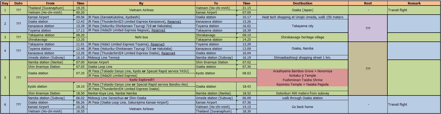ดังนั้นจึงหาสายการบินที่จะไปช่วงปลายก.พ.-มี.ค.เพราะมีวันหยุดด้วยสุดท้ายมาลงตัวที่สายการบิน Vietnam Airlines ที่เป็นสายการบินบริการ full service ราคาไม่แรงและได้ช่วงเวลาที่ต้องการพอดีคือบิน 19.30 น. ถึงสนามบินคันไซ 07.00 น. ก็เดินทางเที่ยวต่อได้เลย ขากลับบิน 10.30 น. ถึงไทย 18.30 น.ไม่มืดมากต่อรถกลับบ้านสะดวก (เสียเวลาต่อไฟลต์เวียดนามทั้งขาไป-กลับประมาณ 3 ชม.)