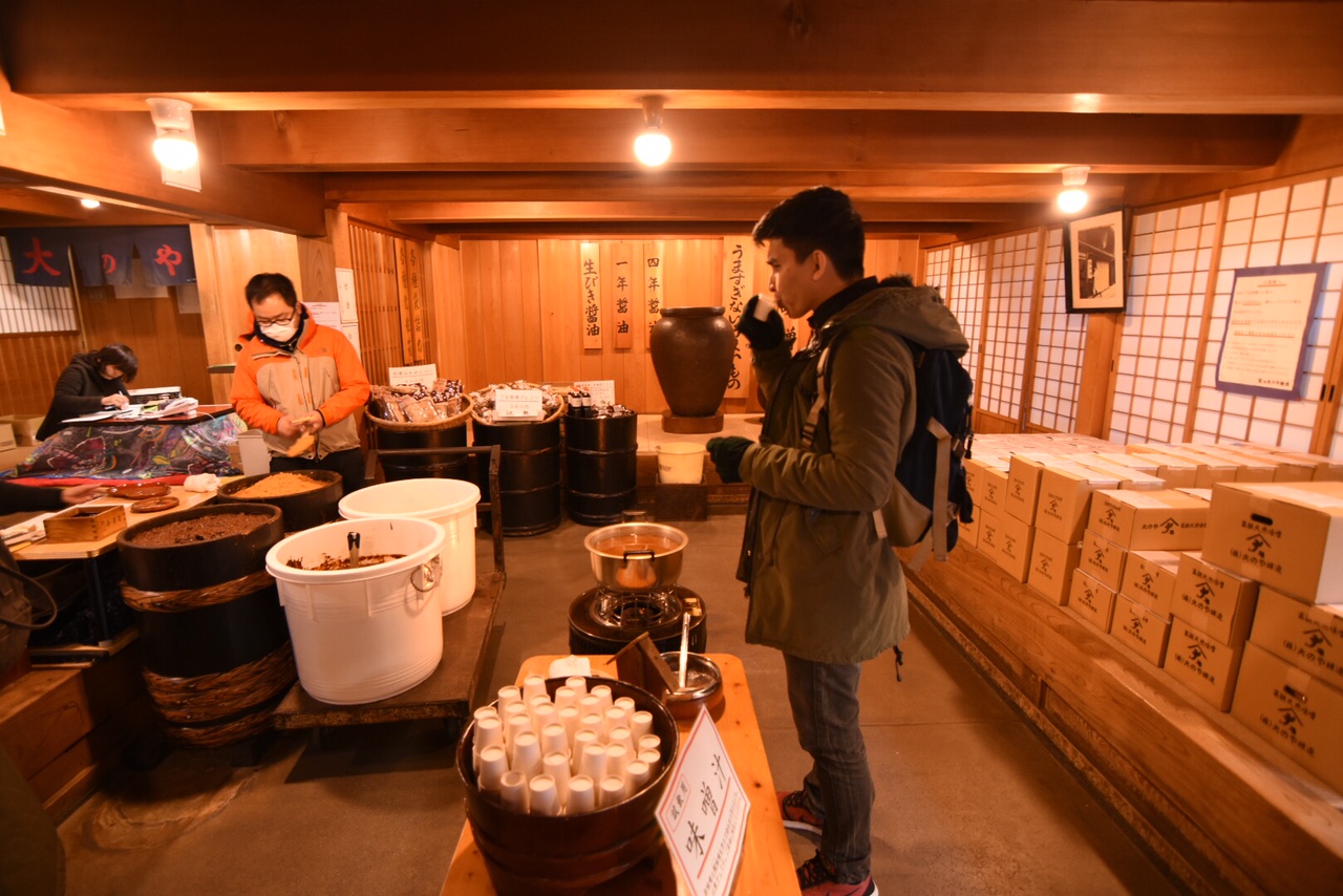 ด้วยว่าที่นี่สาเกเลื่องชื่อ พวกเราก็เดินหาร้านสาเกเพื่อลองชิมสักหน่อย และก็เห็นร้านนึงมีถังหมักเยอะแยะ กลางร้านมีถังต้มน้ำร้อนๆ แล้วผู้คนล้อมเพื่อชิมฟรี น้องก็ไม่รอช้าเข้าไปลองชิมแล้วทำหน้างงๆ บ่นว่ารสชาติทะ
