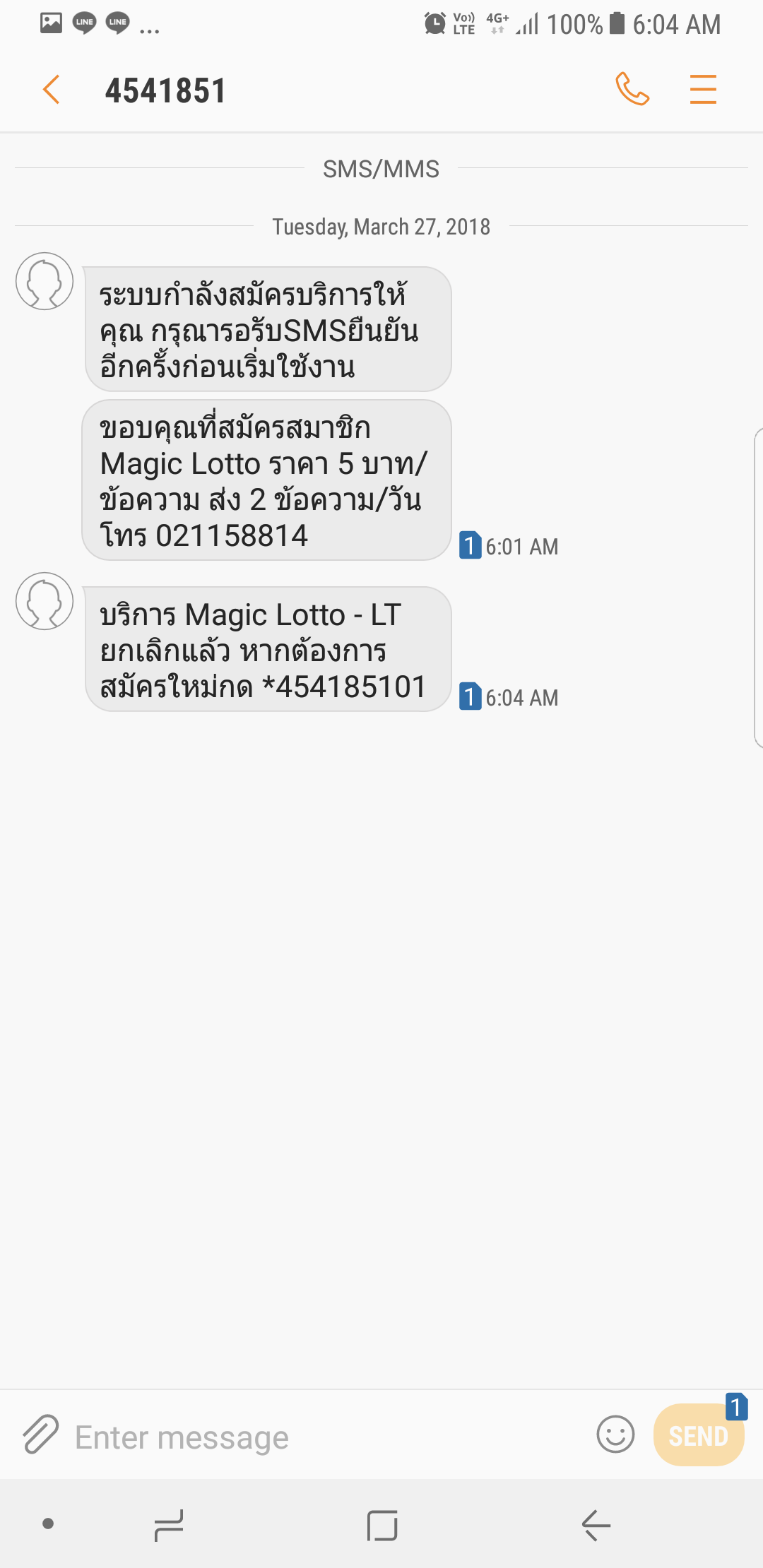 เมื่อเช้าตื่นมายังไม่ได้ทำอะไรเลย เปิดโทรศัพท์ดูปรากฏว่า มีข้อความว่าเราไปสมัคร sms lotto บ้าบออะไรขึ่นมา งง เลย ไม่เคยกดสมัครอะไรทั้งสิ้น เดี๋ยวนี้ระบบมีการโกงสมัครให้เองได้ด้วยเหรอ งง ดีนะที่กดอ่านไม่งั้นโดนเก็บเงินวันละ 10 บาทแน่ๆ ปล่อยให้บริการแบบนี้มาในระบบได้ยังไง แย่มาก