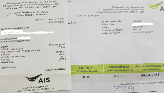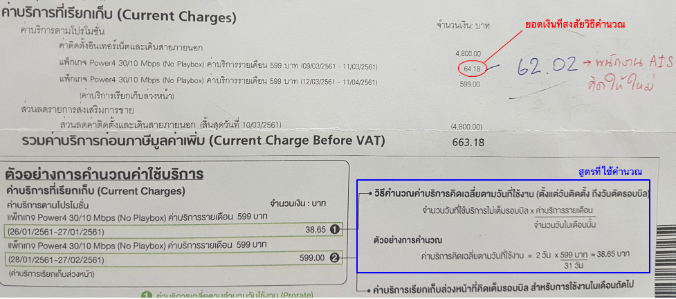 เราให้ช่างมาติดตั้งวันที่ 9 มี.ค. แต่เรื่องได้รับการอนุมัติวันที่ 12 มี.ค. ดังนั้น มันจะมีช่วงที่เราใช้ไปก่อนที่จะได้รับการอนุมัติ (อยู่นอกรอบบิลปกติ) 3 วัน คือ 9-11 มี.ค. ยอดส่วนเกินนี้ตามบิล คือ 64.18 บ. จากรูปแรกทาง ais ใด้ใส่สูตรและตัวอย่างการคำนวณให้ดูด้วย(ที่อยู่ในกรอบสีน้ำเงิน) เราก็ลองคำนวณตามสูตรยังไงก็ไม่ได้เท่าที่แสดงในบิล ก็เลยไปติดต่อเพื่อสอบถามครั้งแรกไม่ที่ชอป ais ก่อนยังไม่ใช่ศูนย์ ก็เข้าไปถามพนักงานที่อยู่ที่เค้าท์เตอร์ ยื่นเอกสารให้ดูพร้อมกับถามว่ายอดนี้คำนวณยังไง ทำไมถึงได้เท่านี้ เค้าก็เอาไปดูๆแล้วก็บอกว่า “อ๋อ มันรวม vat. ค่ะ” เราก็เลยตอบกลับไปว่า แต่ข้างล่างตรงผลรวมมันบอกว่าก่อน vat. นะคะ (รูปแรก บรรทัดที่ตัวหนาที่ยอด 663.18) และถึงจะคิดรวม vat. ก็ไม่ได้ยอดนี้นะคะ พนักงานคนนี้ก็เลยบอกเราให้ไปติดต่อศูนย์เพื่อตรวจสอบ