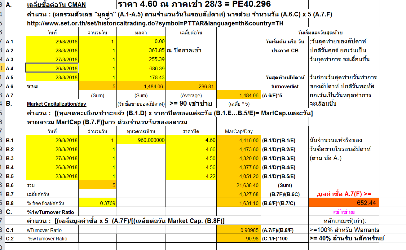 สัปดาห์ Turnover List (23 - 29/3/2561) นี้ เป็นสัปดาห์ที่สอง cman จะไม่ได้รับการยกเว้น Cash Balance ถ้าเข้าข่ายทั้ง 3 หลักเกณฑ์ ถึงแม้ยังเหลือเวลาวันครึ่ง (ภาคบ่ายวันนี้ 28/3/2561 และ พรุ่งนี้ 29/3/2561) ไม่มีซื้อขายเลย ก็ได้เข้าข่ายทั้ง 3 หลักเกณฑ์ โดยเฉพาะถ้าราคาปิดพรุ่งนี้ >=4.60 เท่ากับ >=PE40.296 เข้าข่วย 100% จะโดน Cash Balance เป็นเวลา 6 สัปดาห์เริ่ม 2/4/2561