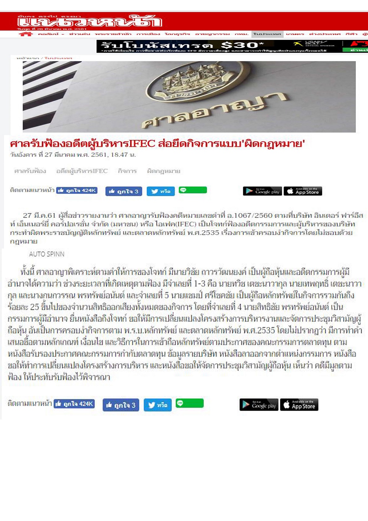https://siamrath.co.th/n/33226 วันที่ 27 มี.ค.61 ผู้สื่อข่าวรายงานว่า ศาลอาญารับฟ้องคดีหมายเลขดำที่อ.1067/2560 ตามที่บริษัท อินเตอร์ ฟาร์อีสท์ เอ็นเนอร์ยี่ คอร์ปอเรชั่น จำกัด (มหาชน) หรือ ไอเฟค(IFEC)