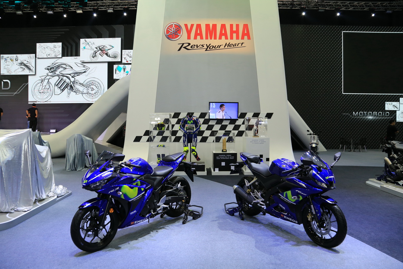 ไฮไลท์ของยามาฮ่ากับเจ้า รถต้นแบบ “โมโตรอยด์” (MOTOROiD) ที่ทรงตัวบนสองล้อได้เองอย่างสมดุล และปฏิบัติตามคำสั่งได้ ไม่ว่าจะเดินหน้า ถอยหลัง หรือว่าหยุดอยู่กับที่