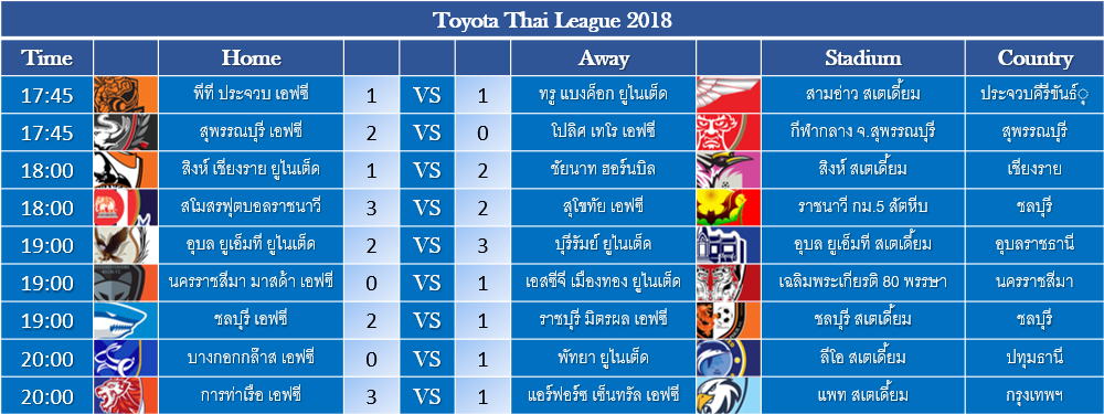 สรุปผลฟุตบอล ไทยลีก 2018 ประจำวันพุธที่ 28 มีนาคม 2561 พร้อมตารางคะแนน
