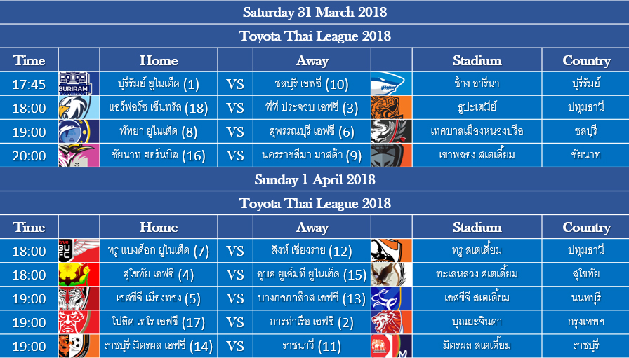 สรุปผลฟุตบอล ไทยลีก 2018 ประจำวันเสาร์ที่ 31 มีนาคม 2561 พร้อมตารางคะแนน
