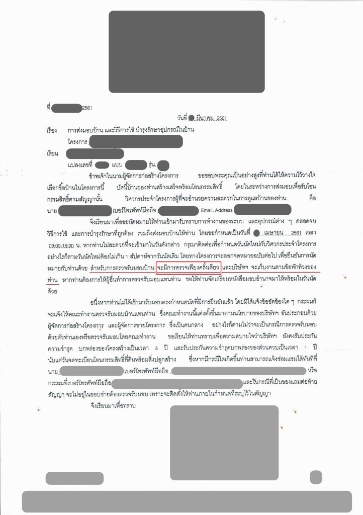 ตัดสินใจซื้อบ้านในโครงการหนึ่ง เป็นบ้านใหม่พร้อมอยู่ และโครงการก็ใกล้ปิดแล้ว ทำสัญญาจะซื้อจะขายแล้ว และอยู่ในขั้นตอนยื่นกู้แบงค์และรอตรวจรับบ้าน จนได้รับจดหมายจากโครงการให้เข้าไปตรวจรับบ้าน โดยมีเนื้อหาที่ทำให้กังวลใจ เนื่องด้วยจากการหาข้อมูลมา มีแต่คนแนะนำว่าการตรวจรับบ้านสำคัญมากถ้าบ้านไม่เรียบร้อยห้ามโอน ห้ามเซ็นยอมรับเด็ดขาด ปัญหายุ่งยากและความเหนื่อยหน่ายจะตามมา ไอ้เราก็เตรียมทำใจแข็งว่าจะไม่ยอมรับอะไรง่ายๆ ต้องเรียบร้อยทุกอย่างจริงจึงจะยอม บ้านก็ไม่ใช่ถูกๆไม่อยากมีปัญหาภายหลัง แต่อ่านจดหมายจากโครงการแล้วสงสัยว่า เรียกให้ไปตรวจบ้านหรือเรียกให้ไปเซ็นรับบ้านซะดีๆ เพราะบอกมาชัดเจนว่าให้ตรวจแค่ครั้งเดียวเท่านั้น ซึ่งถ้าตรวจแล้วไม่มีปัญหาอะไรใหญ่โตก็คงตรวจครั้งเดียวได้ แต่ถ้ามีปัญหาแล้วให้แก้ไข เราอยากจะตรวจอีกมิได้หรือ?