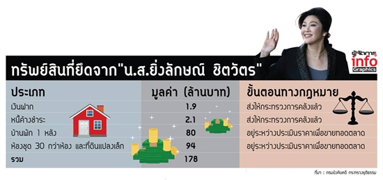 สำหรับการดำเนินการในขั้นตอนต่อไปนั้น พล.อ.อ.ประจิน จั่นตอง รองนายกรัฐมนตรี และรัฐมนตรีว่าการกระทรวงยุติธรรม ซึ่งเป็นหน่วยงานหลักในเรื่องนี้ เปิดเผยว่า เมื่อต้น ก.พ. ที่ผ่านมากระทรวงการคลัง ซึ่งเป็นโจทก์ในคดียึดทรัพย์อดีตนายกฯ ยิ่งลักษณ์ แจ้งมายังกรมบังคับคดีว่าทรัพย์สินของ น.ส.ยิ่งลักษณ์ที่สามารถยึดอายัดได้ทั้งสิ้นมีมูลค่ารวม 178 ล้าน ซึ่งแบ่งเป็น 3 ส่วน คือ
