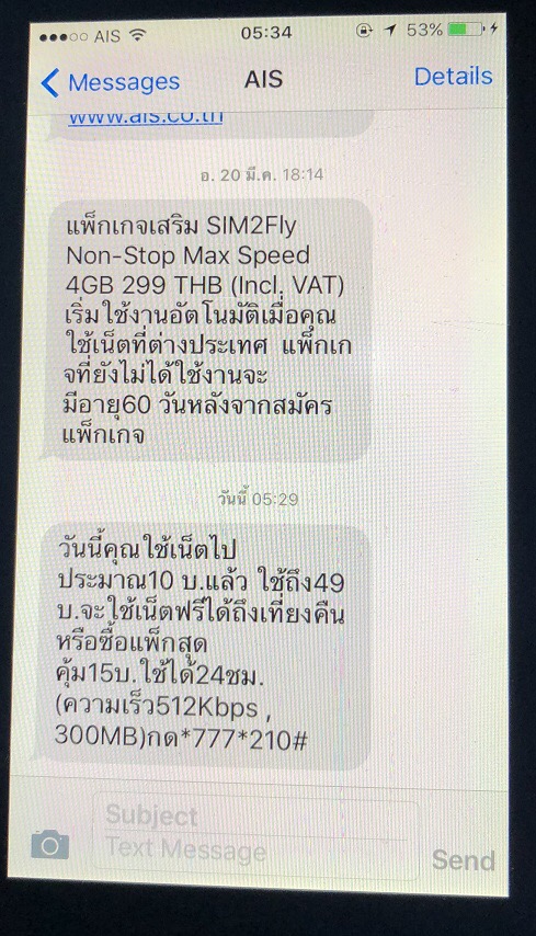 เบอร์นี้เป็นเบอร์ที่ซื้อมาเพื่อสมัคร sim2fly ใช้งานที่ญี่ปุ่นซึ่งปิดเครื่องมาตั้งแต่ญี่ปุ่นจนถึงเมืองไทยตอนตีสีกว่าๆเปิดเครื่องมาเพื่อสลับซิมกลับพบว่ามี sms แจ้งว่าใช้งาน internet ไปแล้ว 10฿