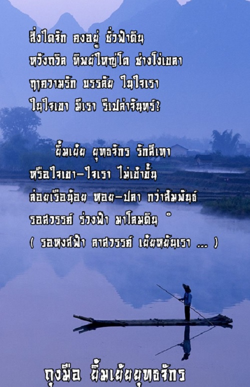 บทกวีนี้ มาแนวยุทธจักรในจงหยวนอีกแล้ว ดูลีลาของท่านผู้ประพันธ์แล้ว กรรมการต้องจัดทำรูปแบบอักษรจีนให้เลย แบบที่ได้ทำให้แม่นาง "พิมเสนยาใจ" ไปแล้วนั่นแหละครับ เหมาะสมที่สุด...