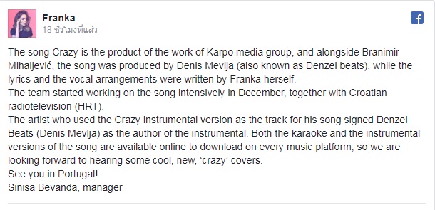 เวป wiwibloggs ได้รายงานเมื่อวันที่ 30 มีนาคมที่ผ่านมาว่าเพลง Crazy เพลงตัวแทนโครเอเชียปีนี้ร้องโดยฟรานก้า กำลังเจองานเข้าค่ะ เพราะมีเพลงๆหนึ่งที่ดันมีดนตรีเหมือนกันทั้งเพลง