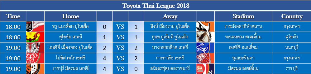 สรุปผลฟุตบอล ไทยลีก 2018 ประจำวันอาทิตย์ที่ 25 มีนาคม 2561 พร้อมตารางคะแนน