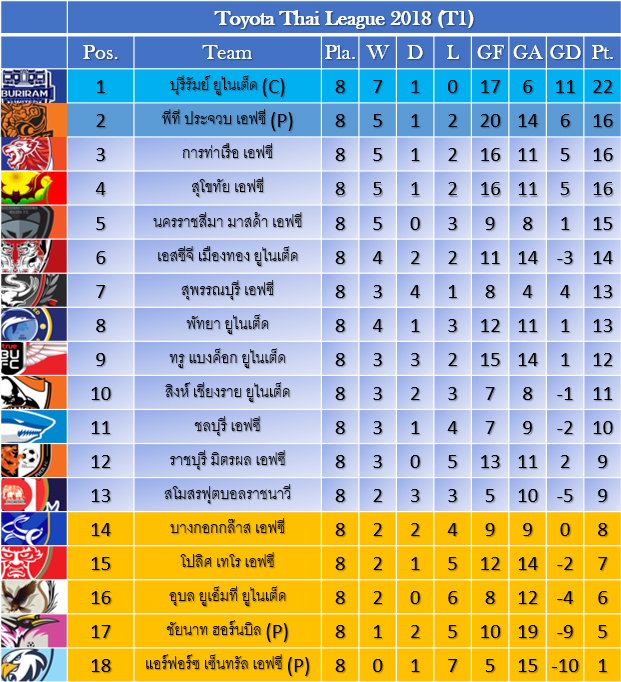 สรุปผลฟุตบอล ไทยลีก 2018 ประจำวันเสาร์ที่ 22 กันยายน 2561 พร้อมตารางคะแนน