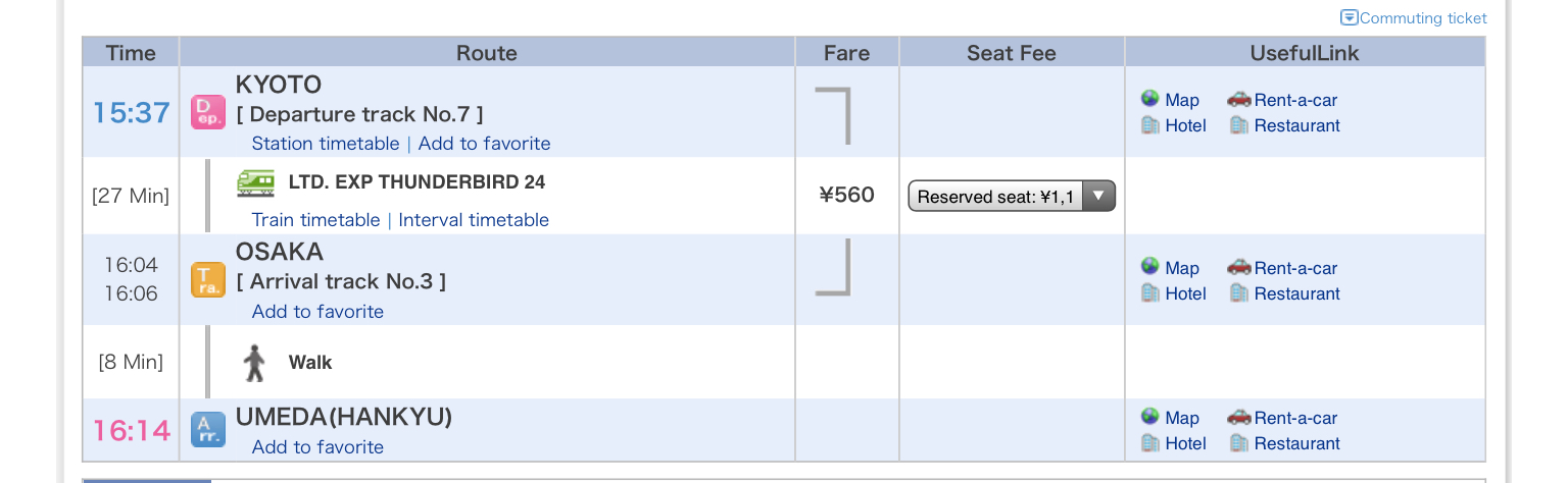 - Kyoto station > Umeda  จากที่ดูในhyperdia มีตารางรถไฟ Thunderbird ไม่ทราบว่าอันนี้ใช้KTPได้ไหมคะ