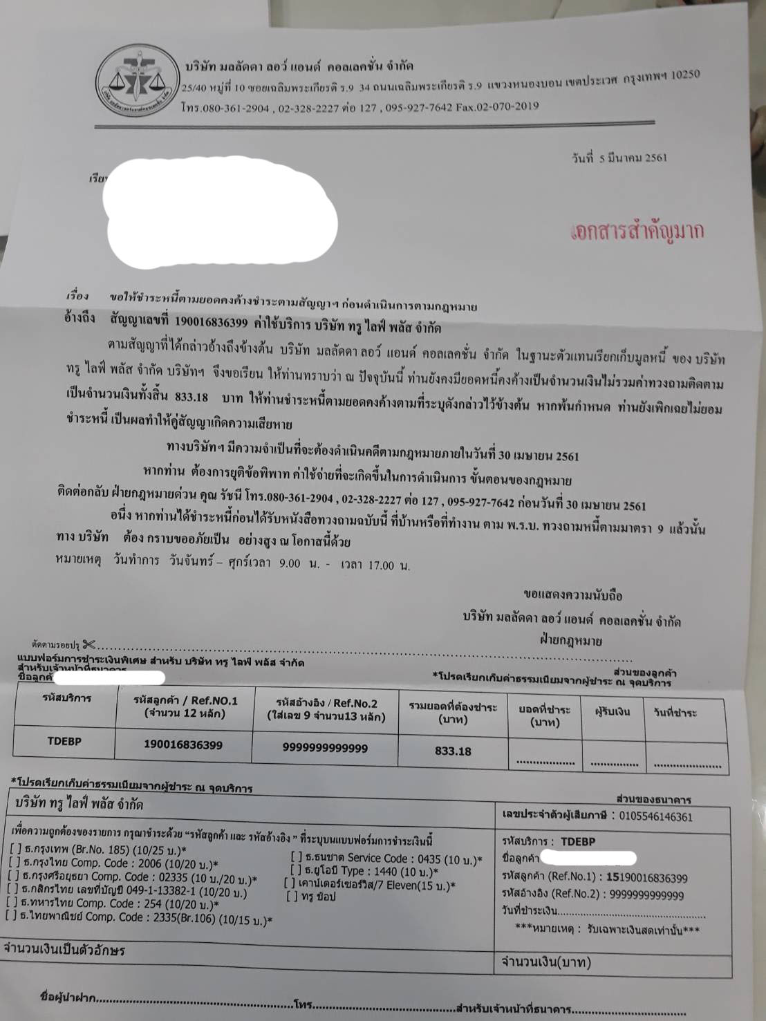 พอดีวันนี้ผมได้จดหมายส่งไปที่บริษัท เป็นเรื่องขอให้ชำระหนี้ตามกฏหมาย ของบริษัท ทรู ไลฟ์ พลัส ซึงตัวผมไม่ได้เคยใช้บริการรายเดือนเกี่ยวกับบริษัทของทรู มาก่อน ส่วนตัวใช้แต่ AIS ผมเลยตกใจและงงมาก อยากให้ทางทรู ชี้แจงเรื่องนี้กับผมด้วยครับ รหัสบัตรประชาชนก็ใส่มั่วๆ มา