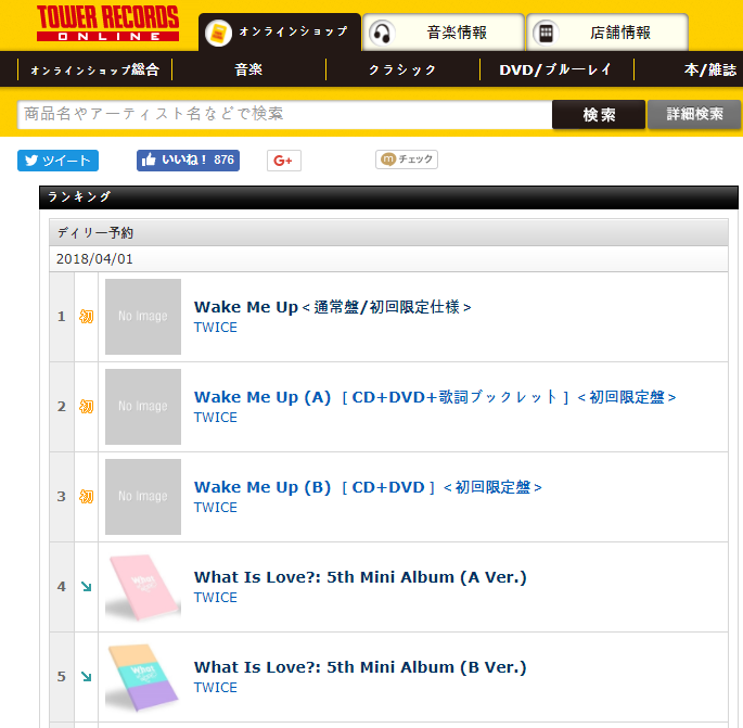 การจัดอันดับยอดขายของ Tower Records Online (ญี่ปุ่น) ในวันที่ 1 เมษายน ซึ่งทั้งหมด 5 อันดับแรก คือ TWICE "Wake Me Up" (เพลงญี่ปุ่นที่กำลังจะปล่อย) และอัลบัมเกาหลี "What is Love?"