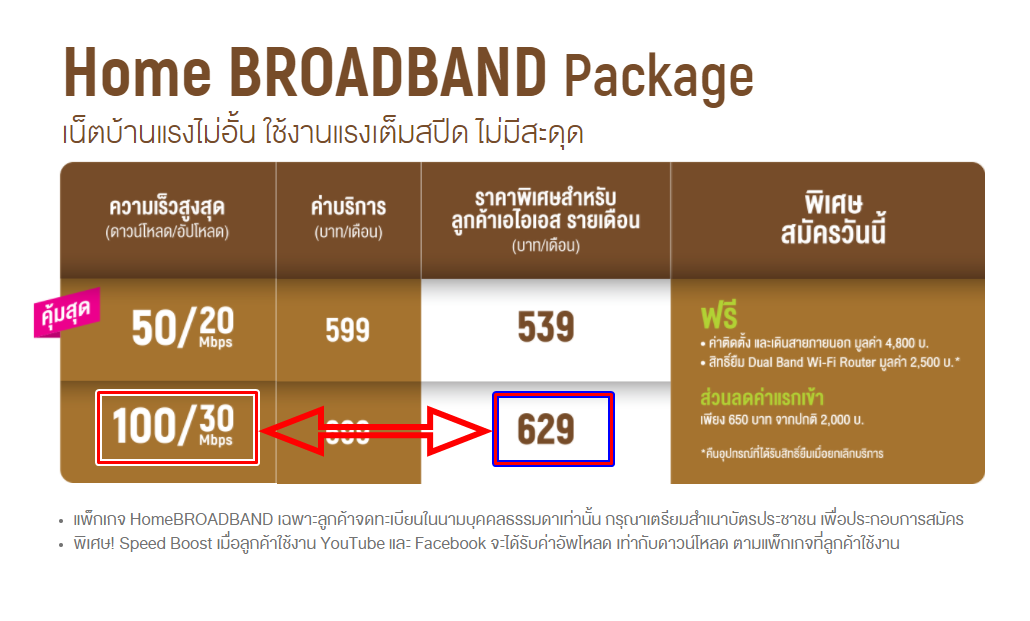 ปัจจุบันแพ็กเก็ตที่ผมใช้ 100/30M จ่ายค่าบริการเดือนละ 799บาท ซึ่งแพงกว่าแพ็กเก็ตตามรูปประกอบข้างล่าง