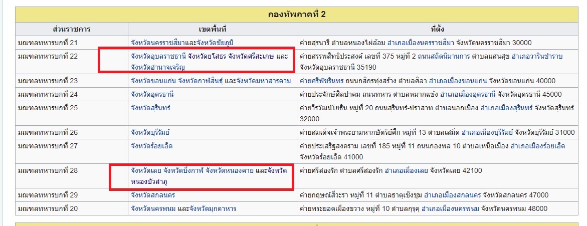 ข้อมูลจากวิกิพิเดีย แสดงขอบเขตพื้นที่ความรับผิดชอบของมณฑลทหารบก (จังหวัดทหารบกในอดีต) ปัจจุบัน