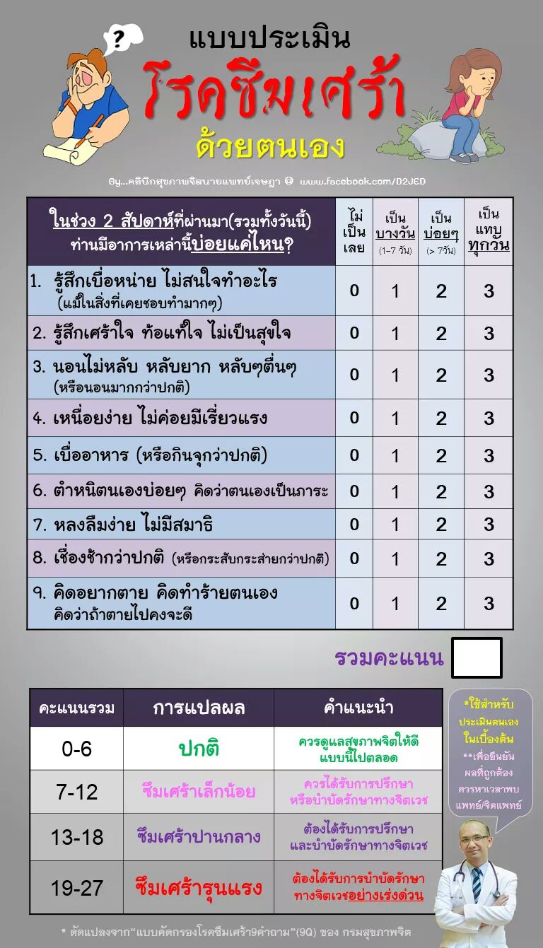 วันแรกที่ไปรับการตรวจที่แผนกจิตเวช รพ.ของรัฐแห่งหนึ่ง ผ่านการตรวจคัดกรองจากพยาบาลเพื่อประเมินอาการเบื้องต้นก่อนส่งเข้าตรวจจริงจัง แค่พยาบาลถามว่ารู้สึกเป็นอย่างไรบ้าง แค่นี้ก็น้ำตาไหลพราก พยาบาลก็แสนดียื่นทิชชูให้ทั้งกล่องแล้วให้ทำแบบสอบถาม9ข้อ คะแนนออกมาได้ที่ 16 คะแนน ถือว่ามีอาการซึมเศร้าระยะกลาง
